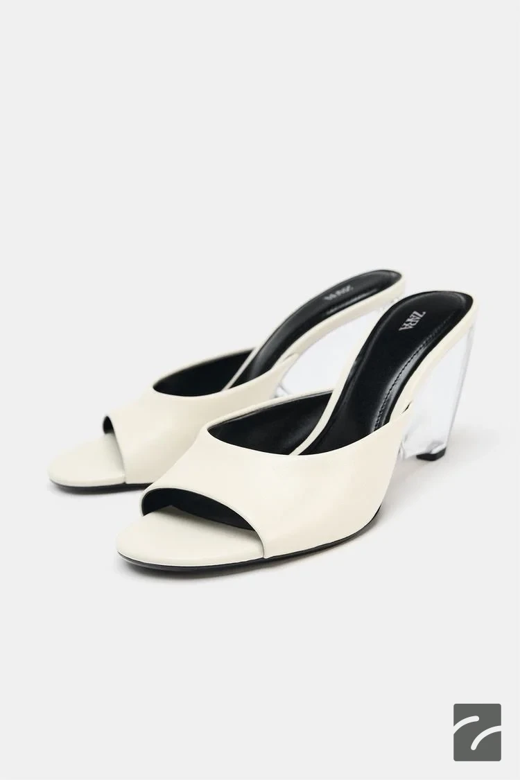 کفش نوع صندل با پاشنه توپر از جنس چرم. دارای جزئیات پاشنه توپر شفاف. با بند جلویی عریض و نوک گرد.