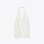 تاپ با یقه هالتر، یقه V و پشت باز. دارای جزئیات چیندار در جلو. با دکمههای جلو و بندهای پشمی در پشت.