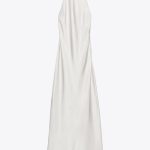 لباس با یقه هالتر و دو بند نازک متقاطع در پشت. دارای جزئیات کمر باز. مناسب برای فرم بدن. دارای زیپ مخفی در درز کناری.