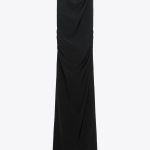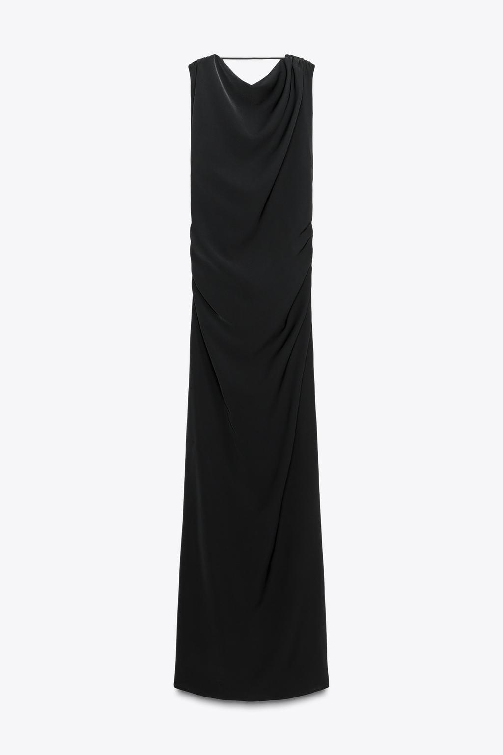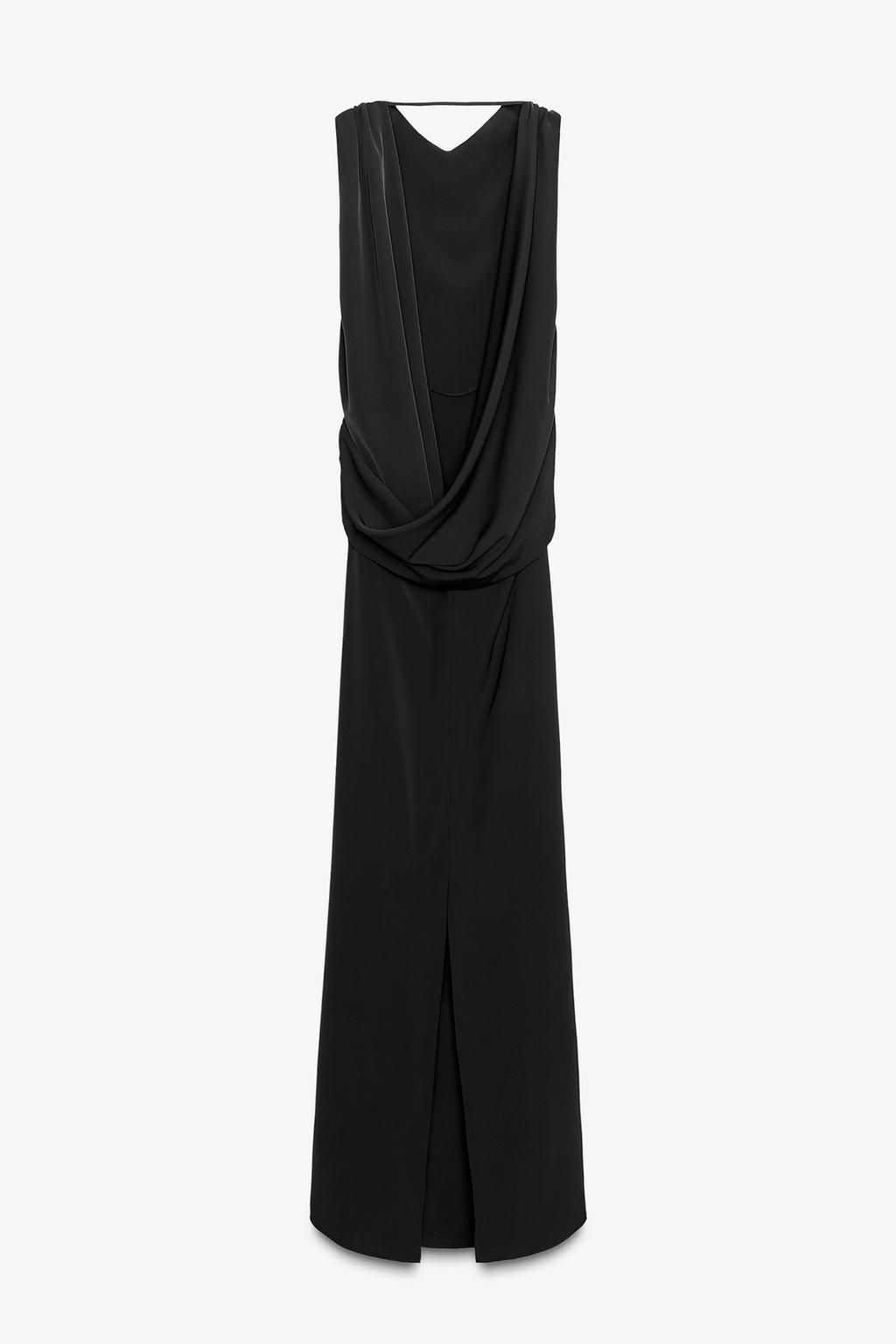 Dökümlü yakalı, kolsuz uzun elbise. Sırtı açık, çapraz dökümlü kumaş ve askılı. Arkası yırtmaçlı.