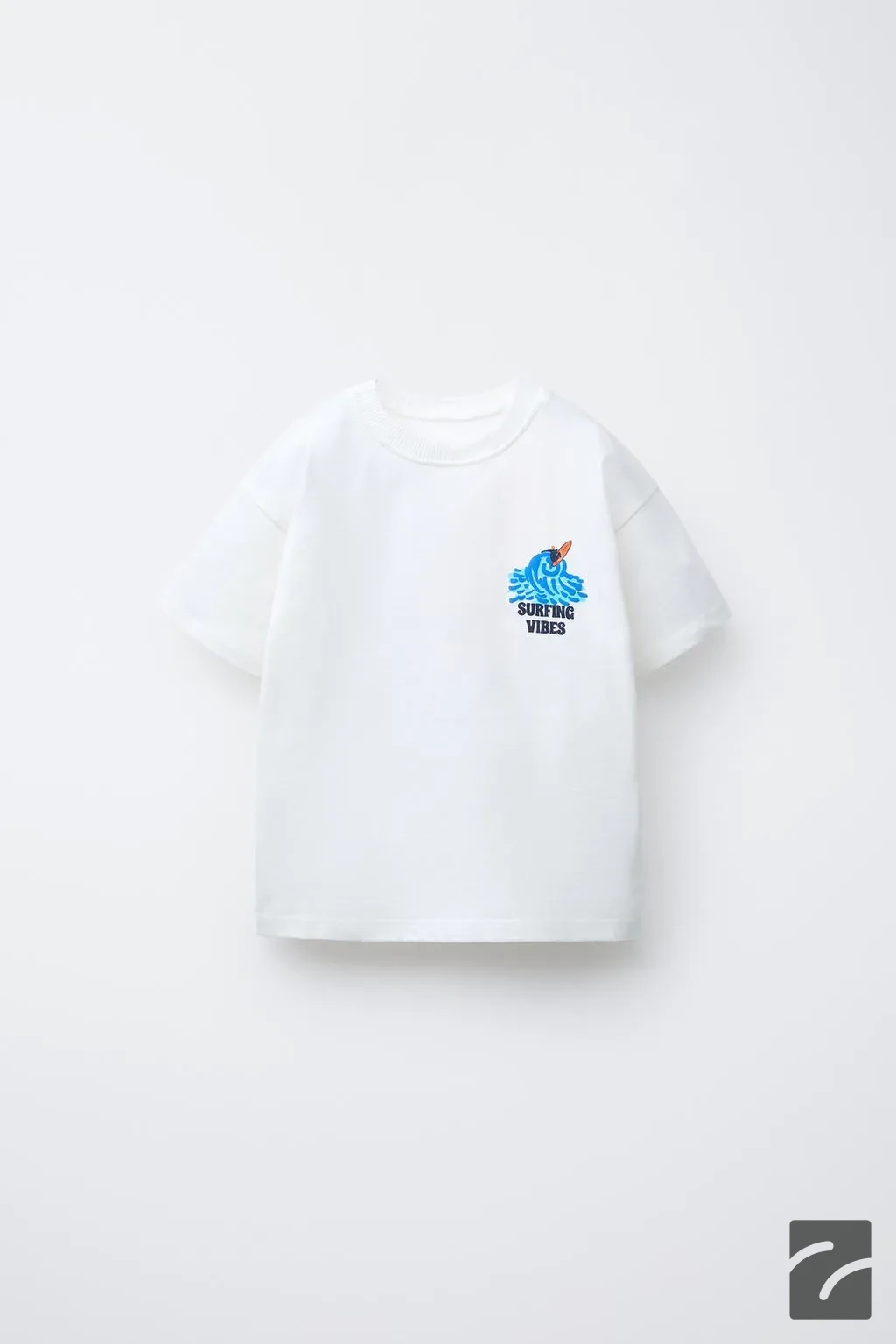 Bisiklet yaka, kısa kollu t-shirt. Ön ve arka kısmı sörf baskılı. %100 pamuklu kumaş.