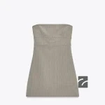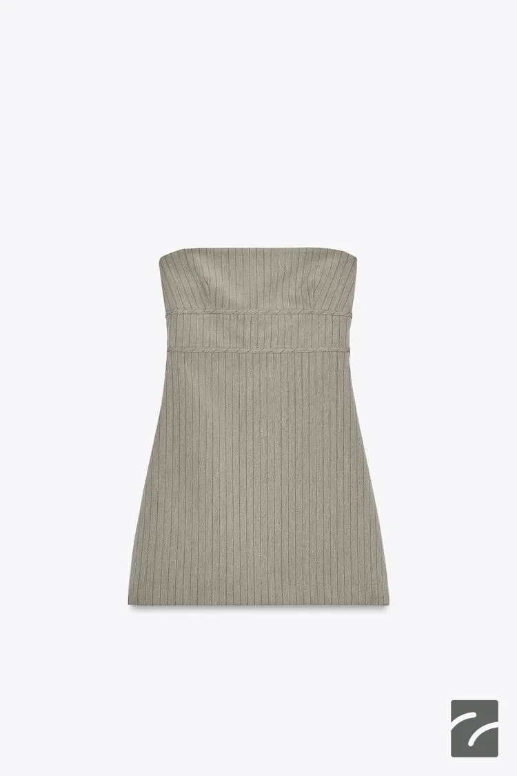 پیراهن کوتاه با یقه صاف و شانههای باز. دارای جزئیات بند قابل تنظیم در قسمت پشت. دارای آستر داخلی. زیپ مخفی در درز کناری.