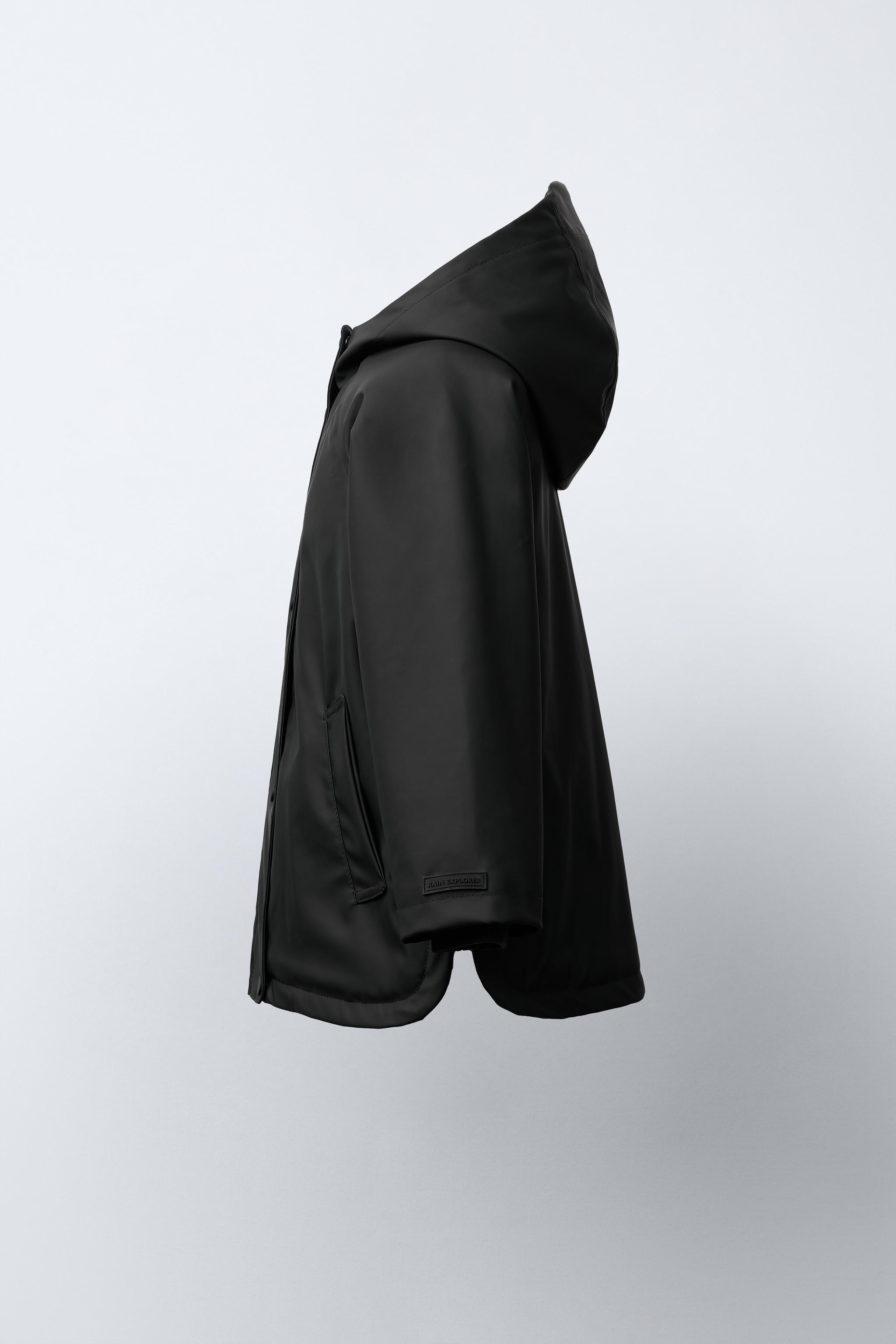 Özel su itici kumaşlı ceket. Kapüşonlu, dik yakalı ve iç manşetli uzun kollu. Önü patletle gizlenmiş fermuar ve çıtçıt düğmeli kapama. Biye detaylı ön cepler. Yanları yırtmaçlı etek ucu. Hayvan desenli suni kürk iç astar.
