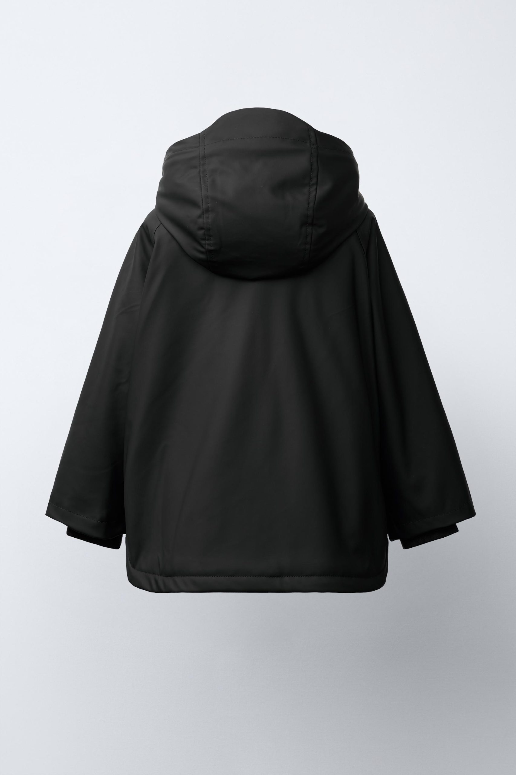 کتانی با پارچه خاص ضد آب. دارای کلاه، یقه ایستاده و آستینهای داخلی. بسته شدن جلو با زیپ مخفی و دکمههای فشاری. جیبهای جلو با جزئیات نوار دوزی. لبههای کناری با شکاف در انتها. آستر داخلی از خز مصنوعی با طرح حیوانات.