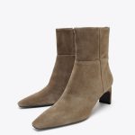 - Süet bilekte bot. Gövde kısmında dikiş detaylı. Orta boy topuklu. İç kısmında fermuar kapamalı. Sivri burunlu.