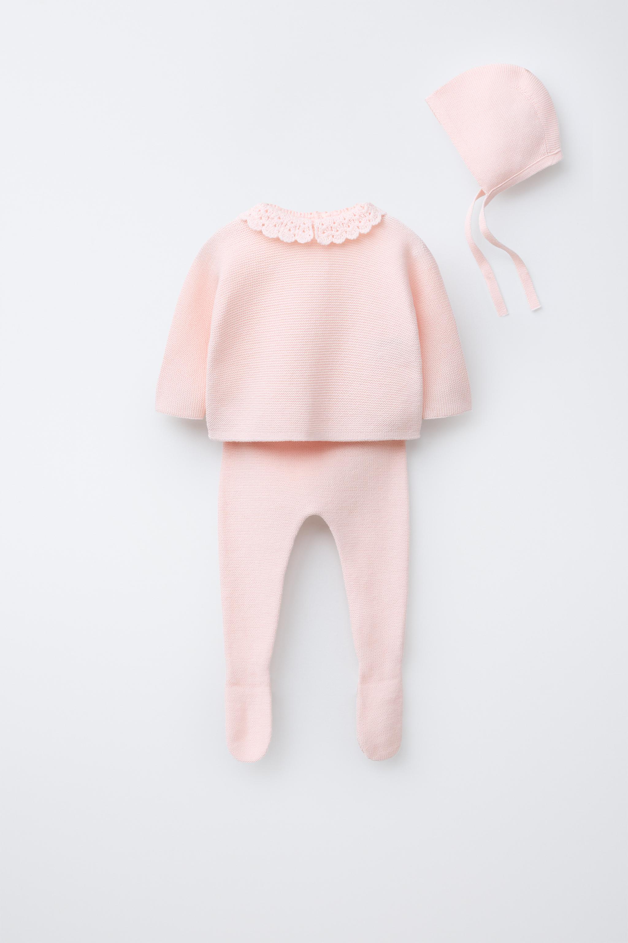 ژاکت با یقه بیسیکلت، بافتنی و آستین بلند. دارای تزیینات فرفری با بافت کروشه. دارای دکمه در قسمت پشت. از پارچه ۱۰۰% پنبهای ساخته شده است.