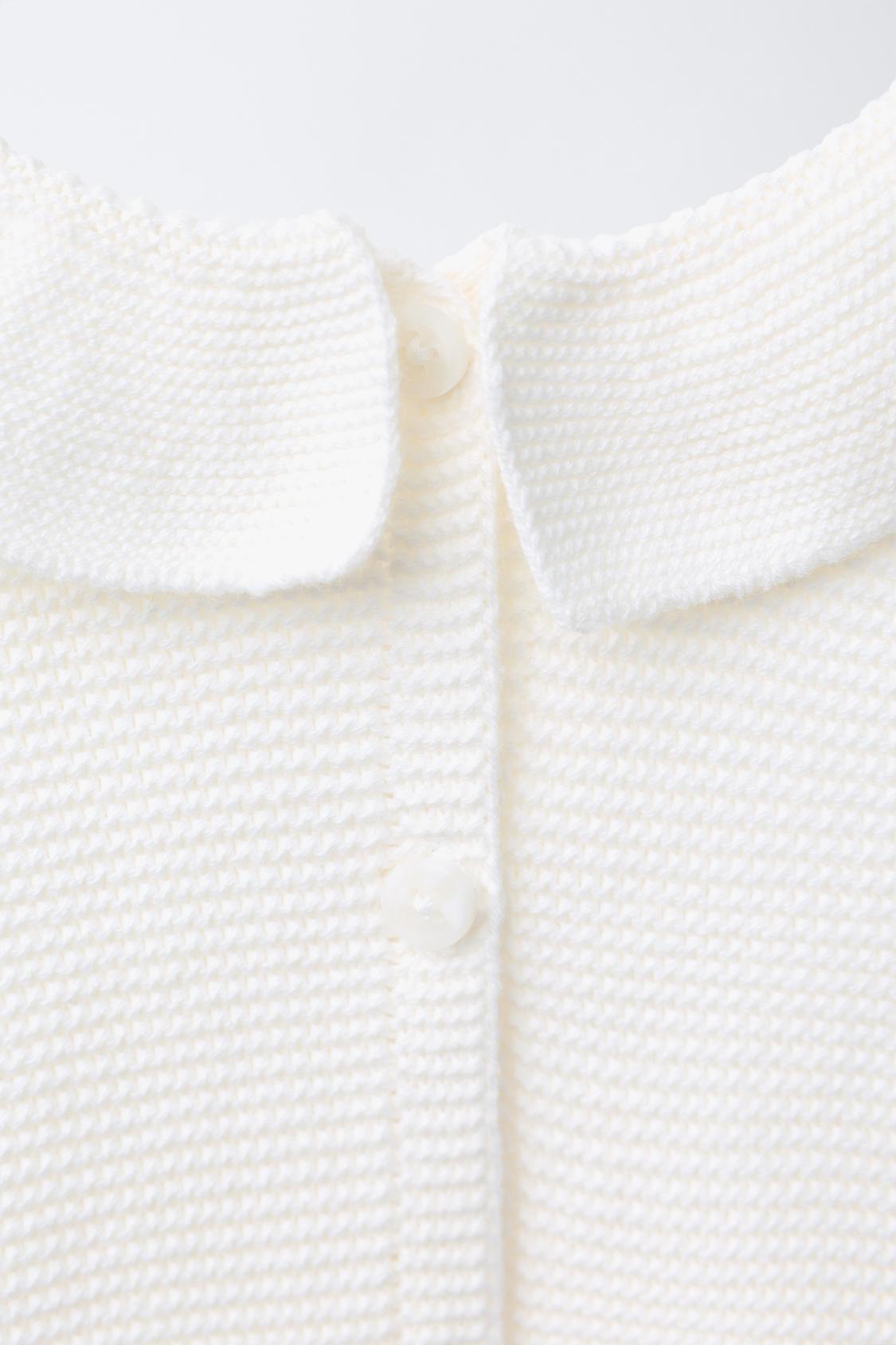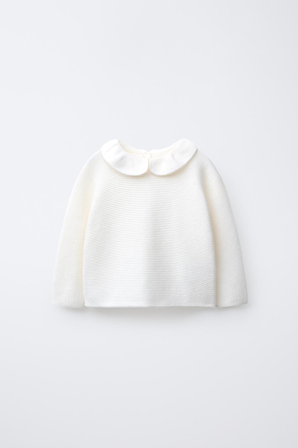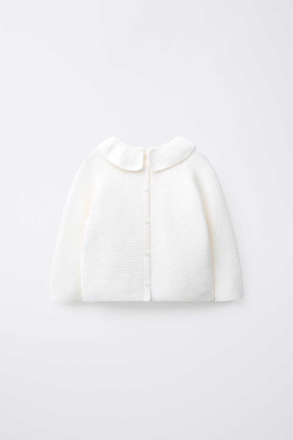 Bebe yaka, uzun kollu, örgü kazak. Sırtı düğmeli.