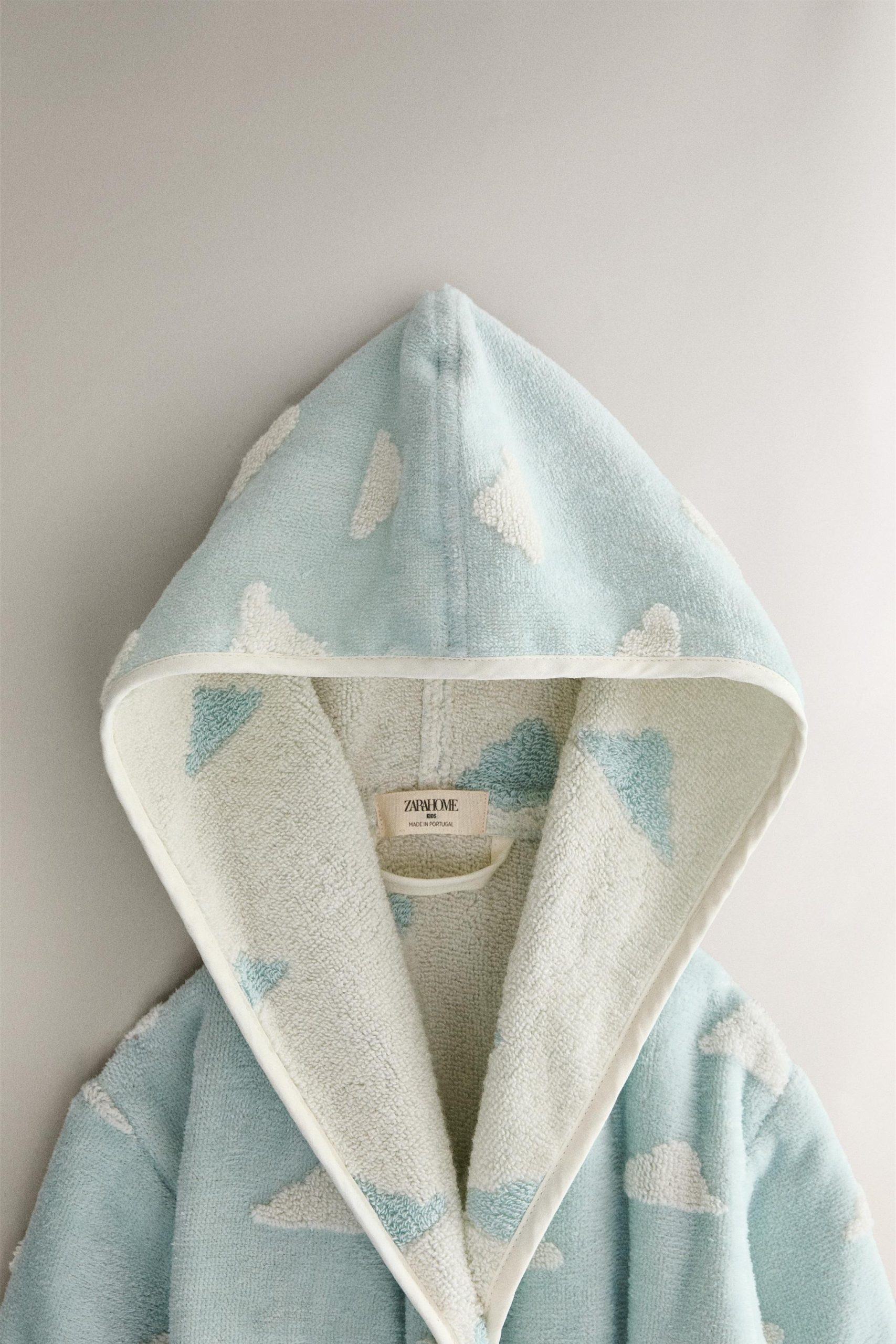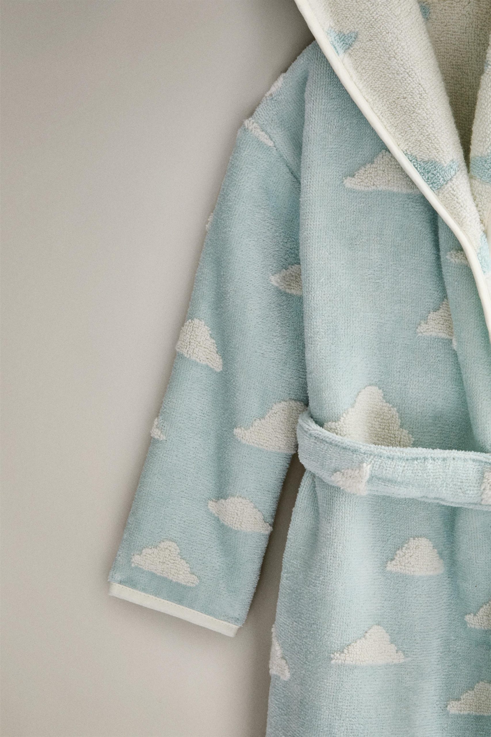 - Toy Story ©Disney/Pixar karakterlerinden Andy’nin odasındaki ikonik duvar kağıdından esinlenerek hazırlanan bulut desenli, yumuşak velur pamuklu çocuk bornozu.