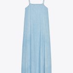 Akışkan denim kumaştan üretilmiş midi elbise. Düz yakalı ve ince askılı.