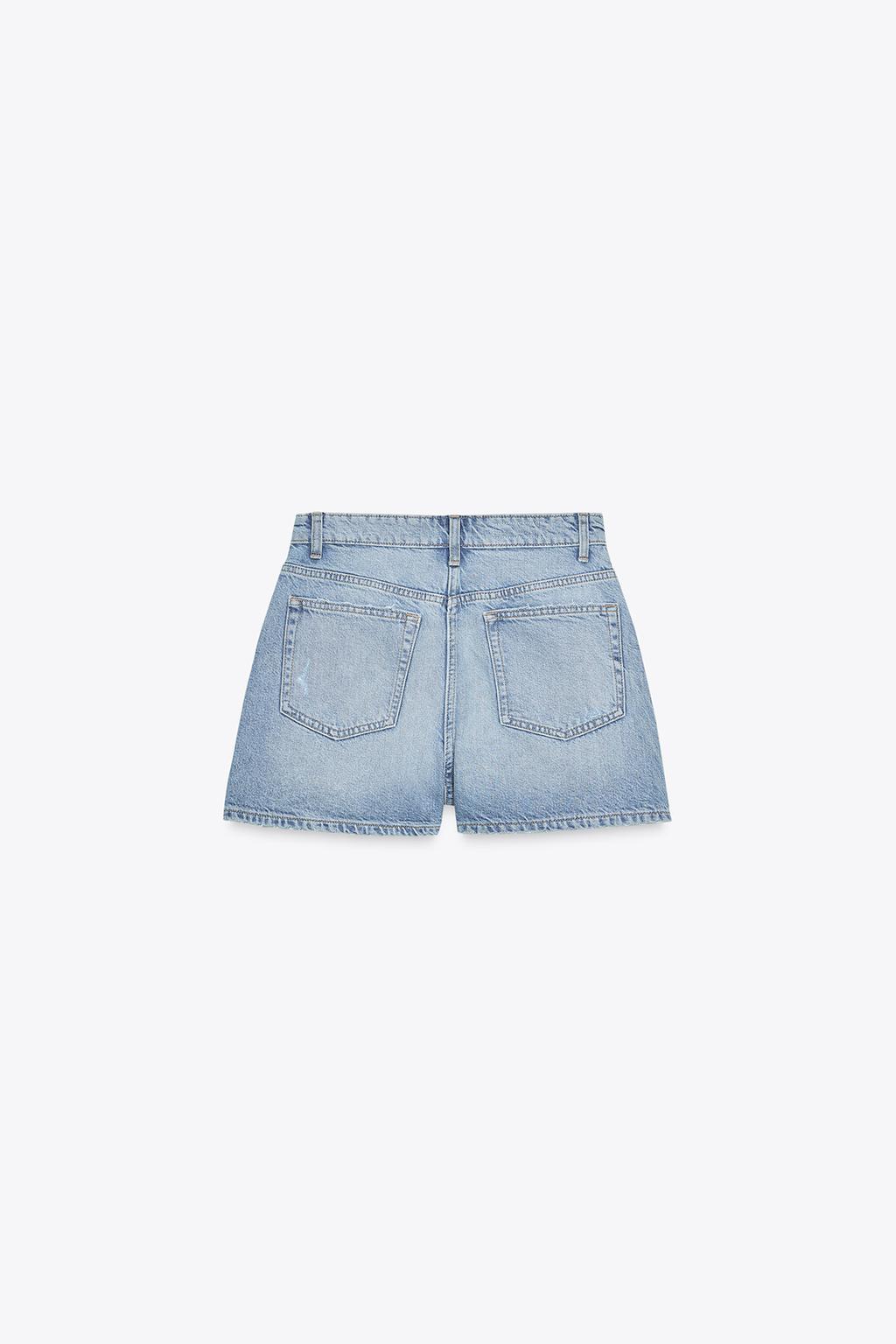Orta bel, kemer köprülü, beş cepli, önü fermuarlı ve metal düğmeli şort etek.