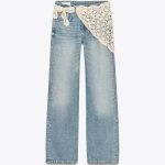 - Beş cepli, orta bel jean. Ekstra uzun, geniş paça. Tığ işi mendil detaylı. Fermuarlı ve metal düğmeli ön kapama.