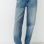 شلوار جین با پنج جیب، با کمر متوسط و از پارچه محکم. دارای قفل کمربند. پاچههای بلند و عریض. زیپ دار و با دکمه فلزی در بالای شلوار.