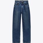 جین با کمر بلند و قد معمولی، دارای پنج جیب و زیپ در جلو با دکمه فلزی.
