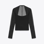 - Kare yakalı ve uzun kollu, vücuda oturan top. Uyumlu renkte kombine kumaş.