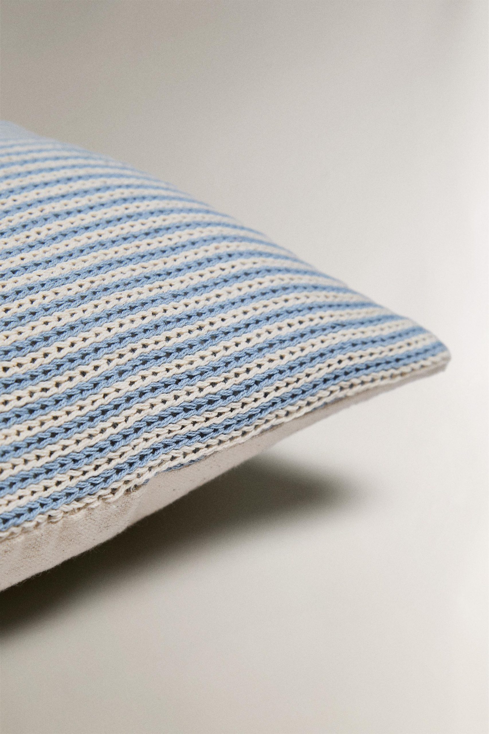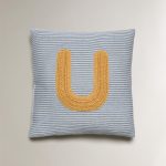 کوسن کودک با طراحی خطی و حروف “U” در وسط، از جنس پنبه و دارای پرکردگی است.