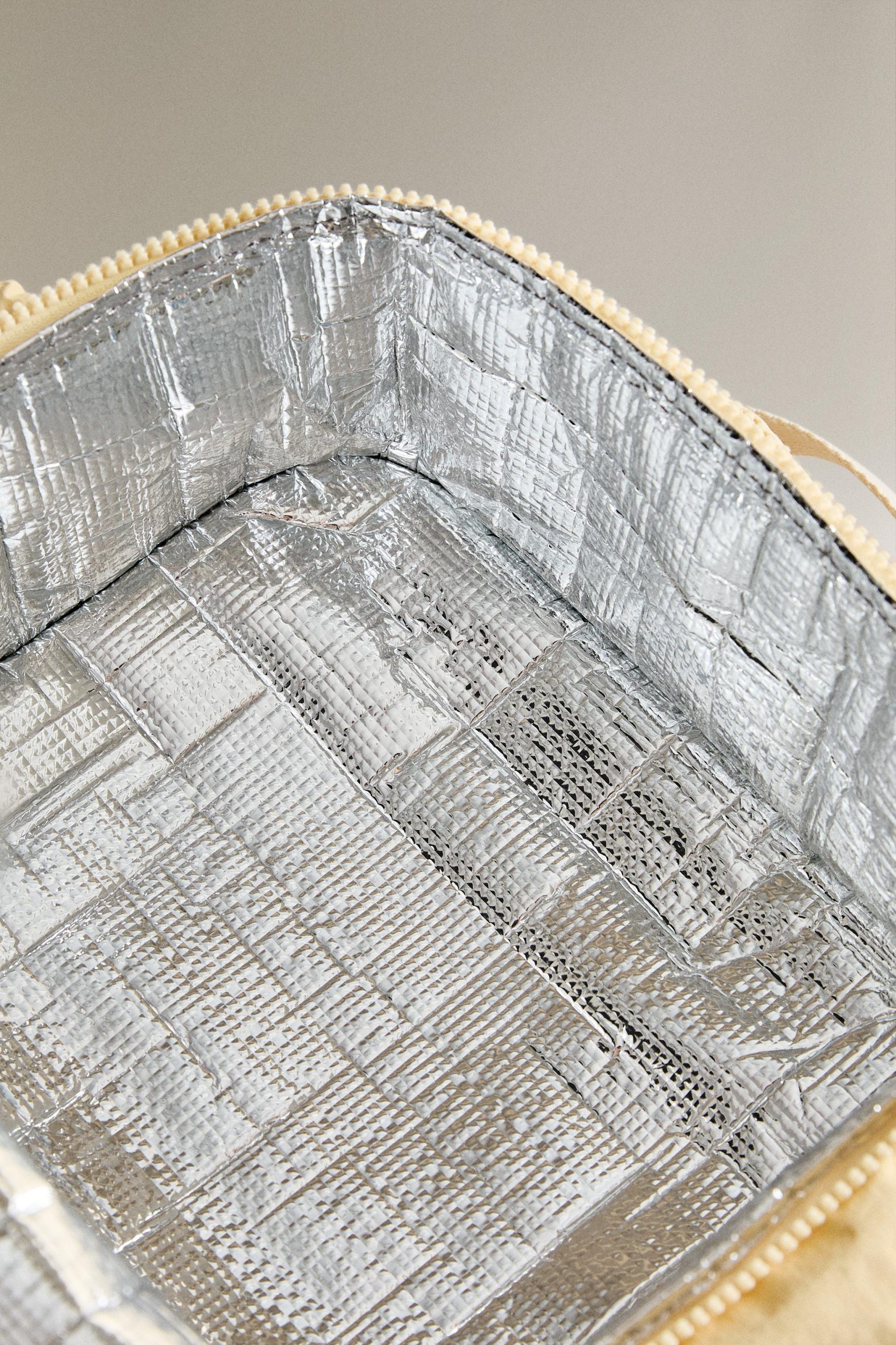 جعبه غذای حرارتی با طراحی ساده، دارای دسته کوتاه، زیپدار و آستری فضایی.
