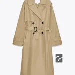 Klapa yakalı ve uzun kollu trençkot. Detayları kayışlarla tamamlanmıştır. Biyeli ön cepleri bulunur. Arkası yırtmaçlıdır. Önü kruvaze düğmeli ve aynı kumaştan kemerlidir.