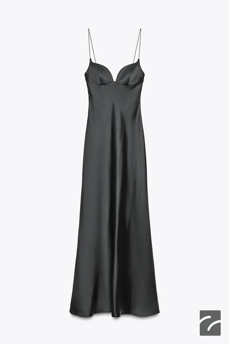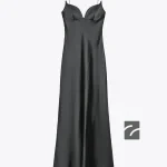 - Saten kumaştan üretilmiş uzun elbise. Kalp yakalı ve ince askılı. Arkası dikişe gizlenmiş fermuar kapamalı.