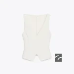 توپ تولید شده از بافت محکم، نرم و مات، با پارچه بافتنی انعطاف‌پذیر و الاستیک. دارای یقه V و بدون آستین. جیب با لبه‌دوزی شده در ناحیه سینه. لبه دامن به صورت نامتقارن.