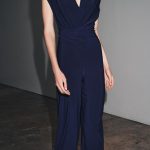 • V yaka, vatkalı kolsuz, drape detaylı, geniş paçalı uzun tulum.