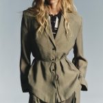 Dökümlü kumaştan üretilmiş blazer. Katlı yaka ve vatkalı uzun kollu. Aynı kumaştan bağlamalı ince kemerli. Önden düğmeli kapama