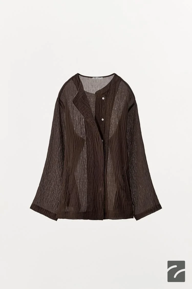 - %9 viskoz ve keten karışımından üretilmiş gömlek. Kruvaze yuvarlak yakalı ve uzun kollu. Ön kısımda biyeli cepler. Patla gizlenmiş, önü gizli düğme kapamalı.