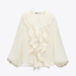 - Liyosel iplikten üretilmiş gömlek. V yaka ve lastikli, uzun kollu, büzgülü. Volan detaylı. Önden düğme kapamalı.