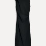 İnceltilmiş viskoz karışımlı kumaştan midi elbise. Asimetrik yaka ve kolsuz. Omuzları metal aplike detaylı ve drapeli kumaşlı. Dikişe gizli yan fermuarlı.
