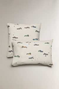 کوسن کودک با طرح راهراه و دوخت حرف “W” در وسط، از جنس پنبه و شامل پرکننده است.
