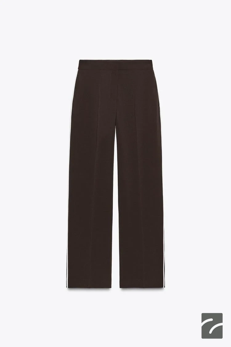 شلوار با کمر بلند. دارای جیبهای جانبی و جیبهای پشتی با لبهدوزی. جزئیات نوار نازک با رنگ متضاد در کنارهها. بسته شدن از جلو با زیپ، دکمه داخلی و قلاب.