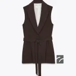 Pervaz yakalı ve V yakalı, kolsuz uzun yelek. Ön kısımda dikişlere gizlenmiş cepler. Aynı kumaştan bağlama kemeri. Yan tarafında kontrast renklerde ince şerit detayı. Önü kaplamalı düğmelerle kapatılır.