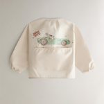 - Reçineli pamuklu, uzun kollu, arkadan çıtçıtlı ve yarışçı pilot köpek motifli bebek önlüğü.