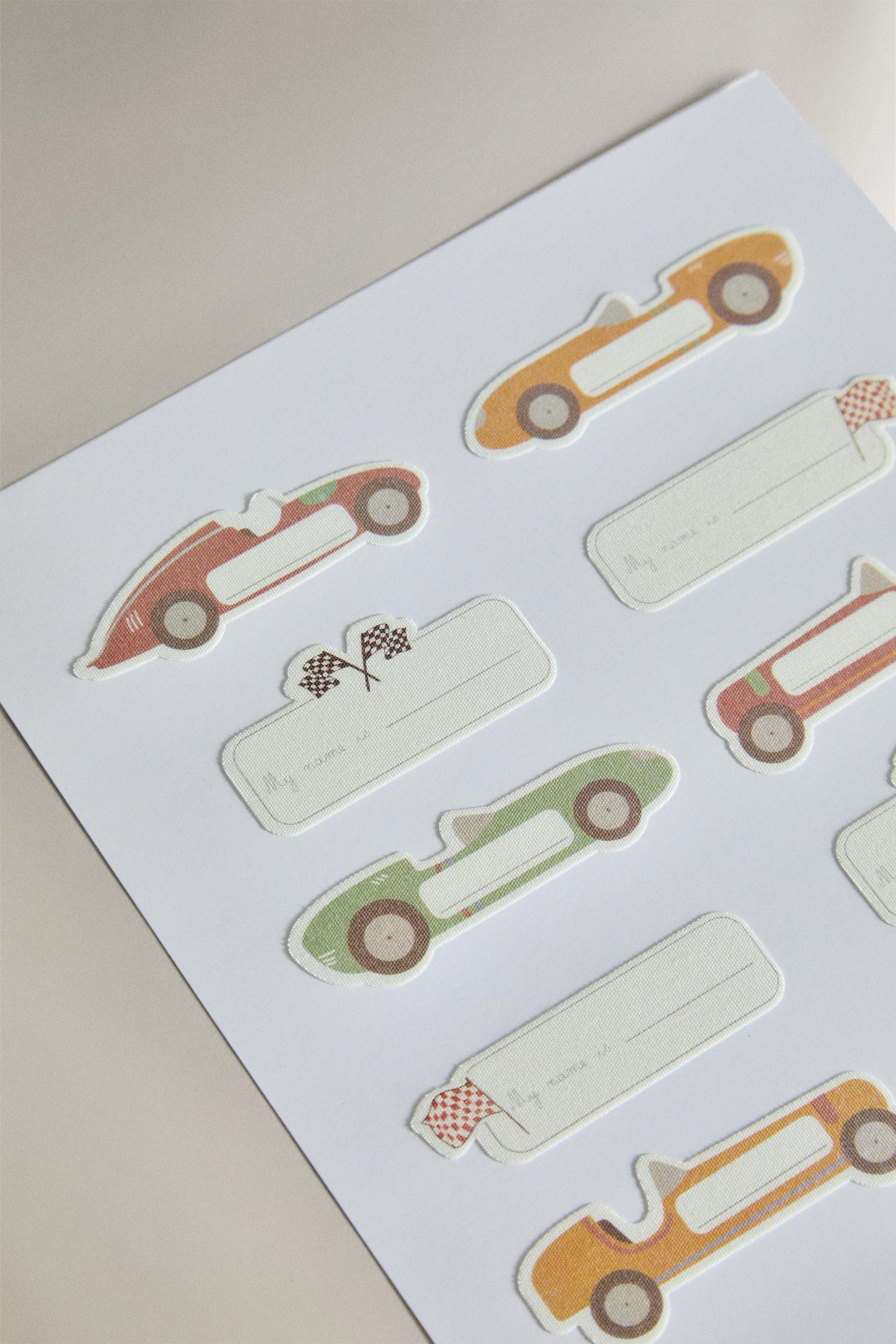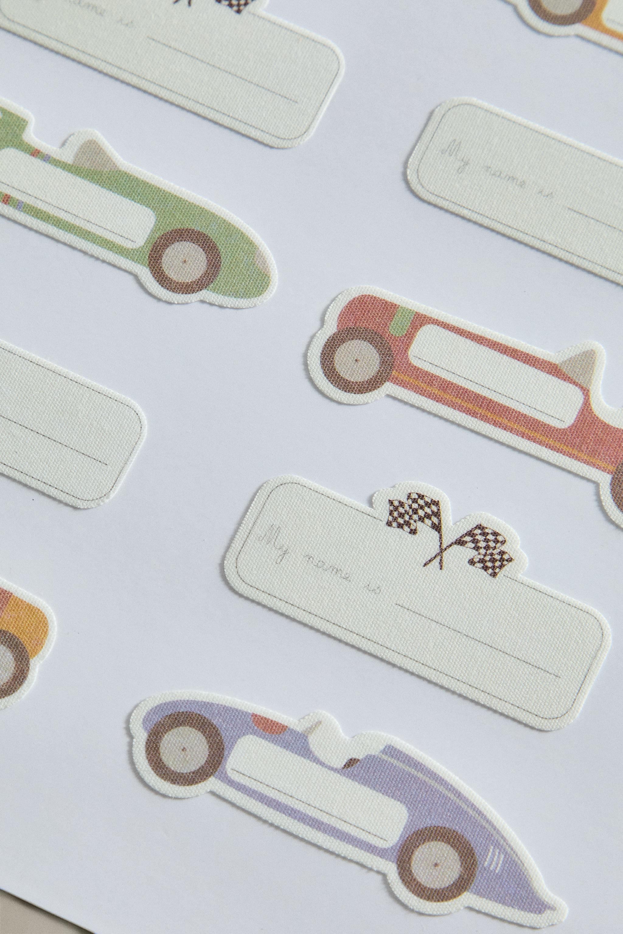 Yarış arabası şeklinde ve yarış motifleriyle tasarlanmış, çocuklara özel tanımlayıcı ütüyle yapışan etiketler veya yamalar. Isıyla yapışır. 30 adet içerir.