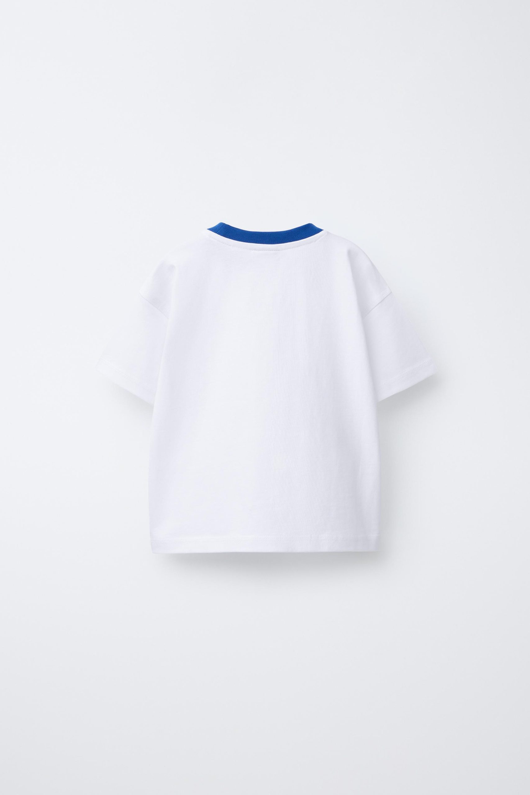 تی‌شرت کوتاه‌دست با یقه دوچرخه‌ای و لبه‌های رنگی متضاد. دارای چاپ نوشته در قسمت جلو. تهیه شده از ۱۰۰% پنبه.