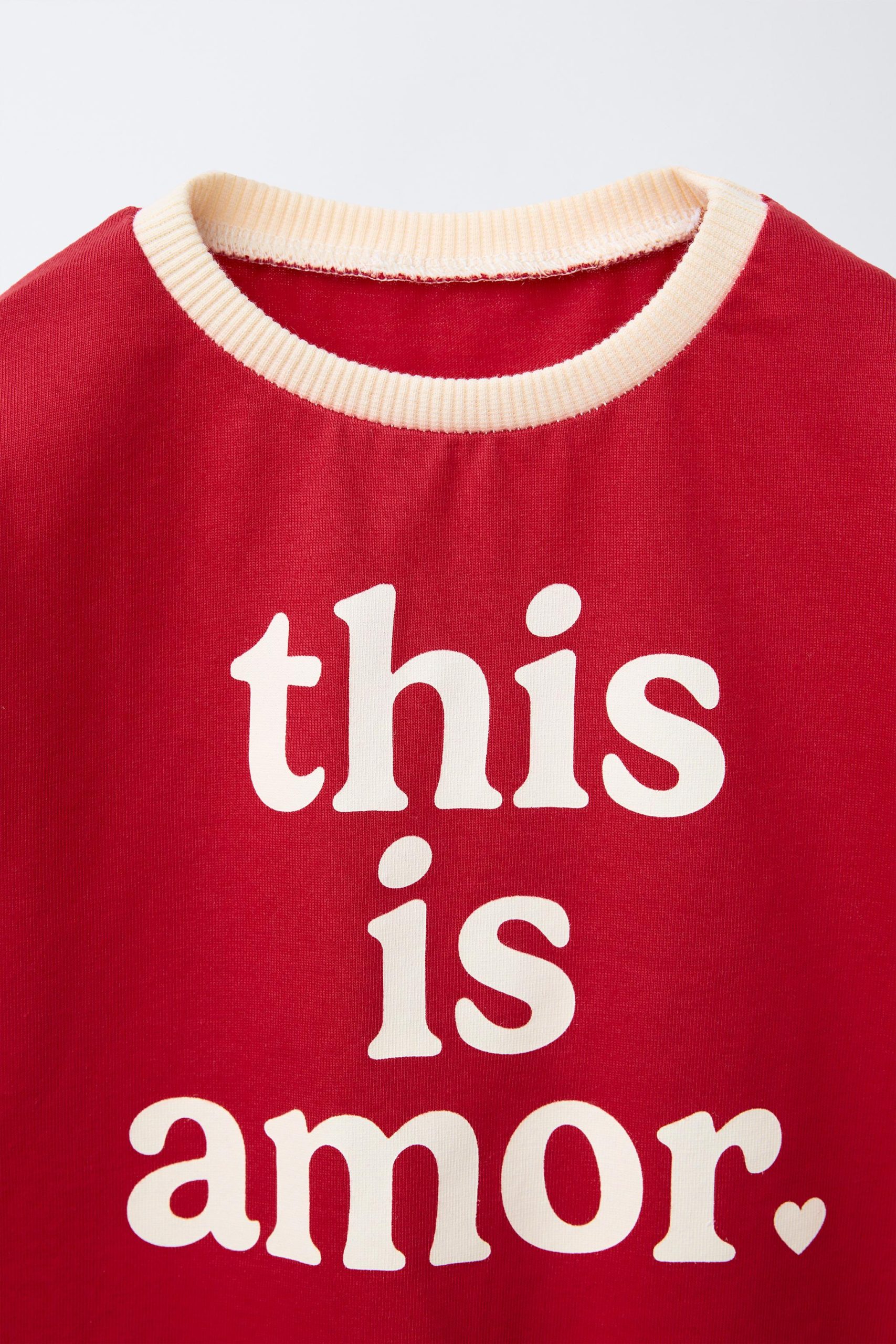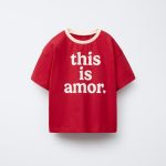 تی‌شرت یقه گرد و کوتاه‌دامن با چاپ نوشته در جلو. از ۱۰۰% پنبه تهیه شده است.