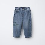 شلوار جین گشاد با کمر قابل تنظیم و دکمههای چسبی در جلو. دارای جیب جلو و جیب یقهای در پشت. طرفین با جزئیات نوشته چاپی تزئین شده است.