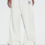 شلوار ساده با پاچههای صاف، 100% پنبهای، دارای کمر بلند، بند دار و قابل تنظیم، با جیبهای کناری و جزئیات نوشتههای گلدوزی شده به رنگ متضاد.
