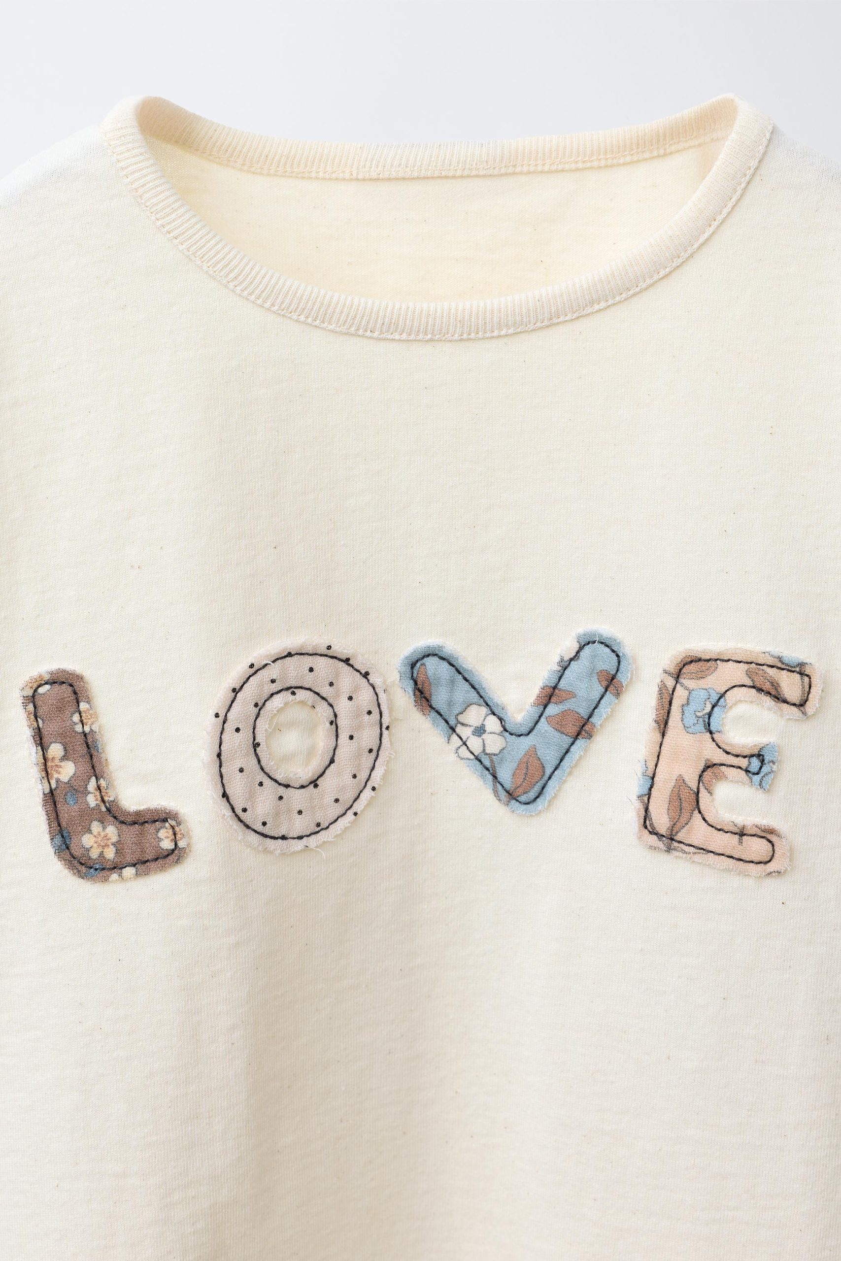 Bisiklet yaka, uzun kollu tişört. Göğüs kısmında yazı yaması aplikeli. %100 pamuklu kumaş.