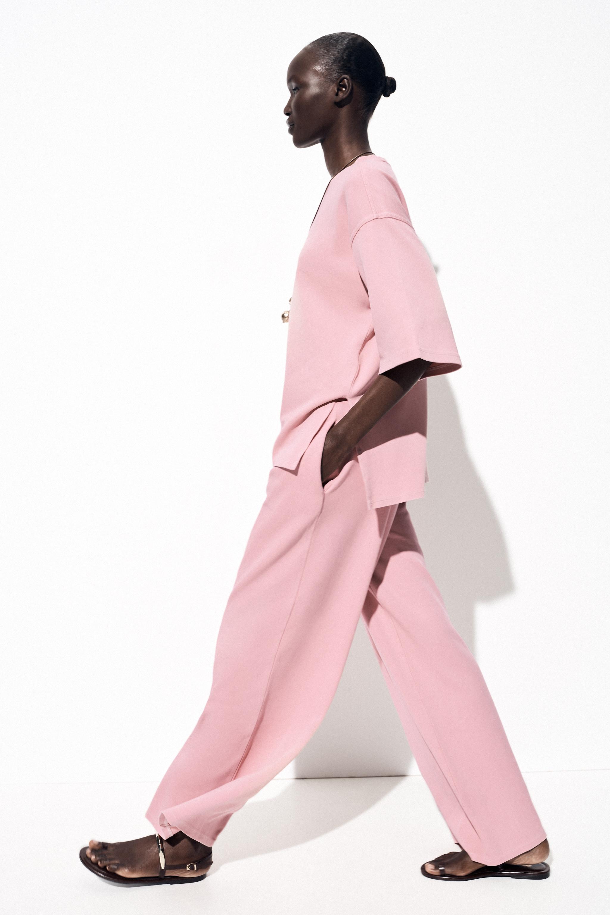 Sıkı, yumuşak ve mat örgüye sahip esnek ve rahat triko kumaştan pantolon. Orta bel ve lastikli bel. Dikişte gizli yan cepler. Önde pens detayı. Bol paça.