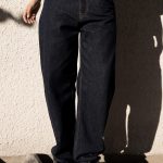 جین با کمر بلند و قد معمولی، دارای پنج جیب و پل کمربند. جلوی آن زیپ و دکمه فلزی دارد.