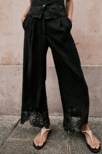 شلوار کتان با کمر الاستیک و پاچههای جمعشده. این محصول از ۸۵٪ پشم و ۱۵٪ کشمیر تهیه شده است.