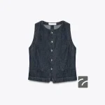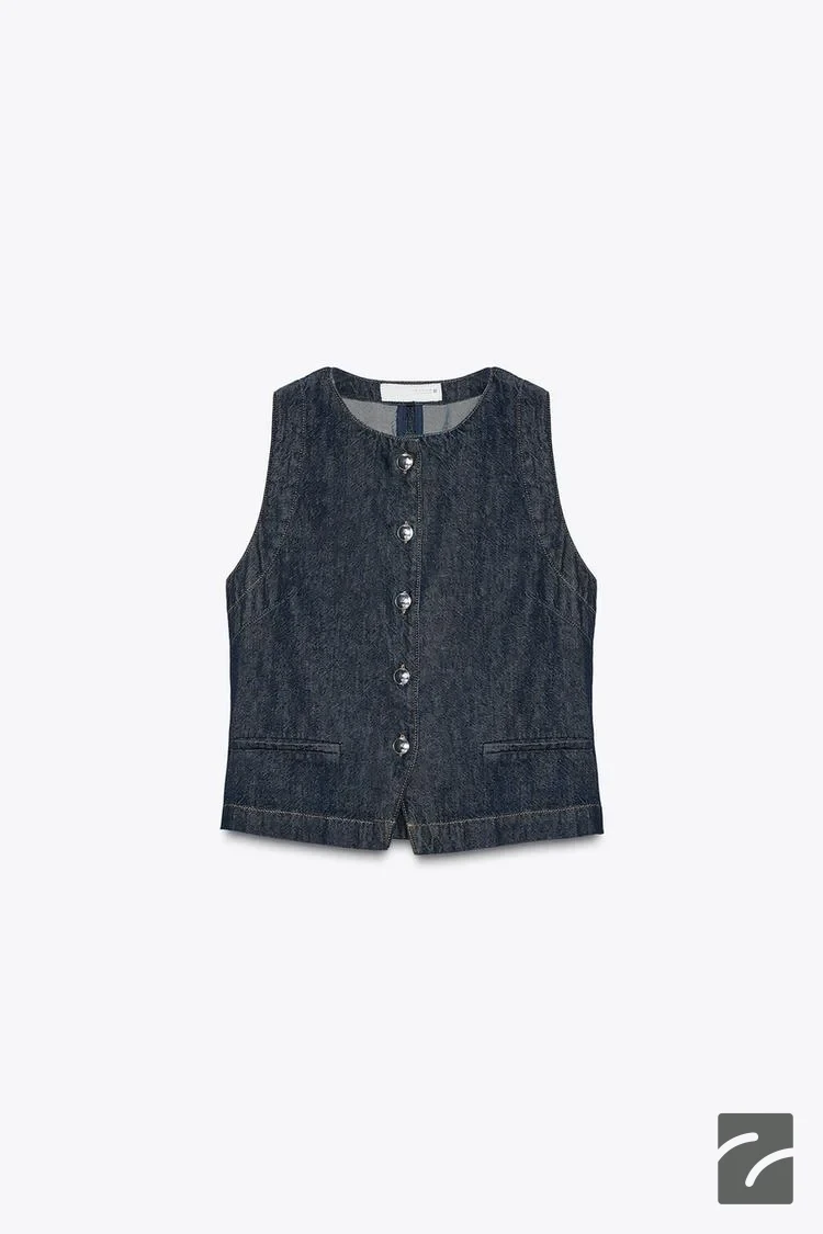 Bisiklet yaka, kolsuz yelek. Ön kısımda biyeli cepler. Önü metal düğme kapamalı.