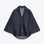 V yaka, düşük, geniş, dirsek altı kollu, klapa yakalı gömlek. Asimetrik etek ucu. Önden metal düğme kapamalı.