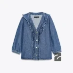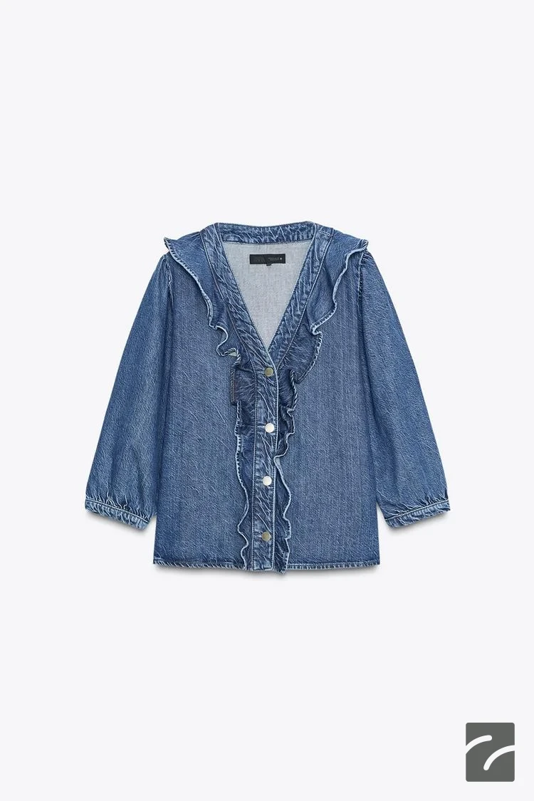 V yaka, volanlı ve uzun kollu gömlek. Yanları yırtmaçlı. Önden düğme kapamalı.