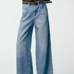 شلوار جین با کمر بلند و پاچههای عریض و کوتاه. دارای پنج جیب و طراحی بدون درز. بسته شدن از جلو با زیپ و دکمه.