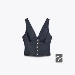 تاپ با یقه و بندهای ضخیم. دارای بسته شدن با دکمه فلزی در جلو.