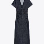 - Yaka detaylı, V yaka, kısa kollu ve manşetli elbise. Beli büzgülü, önde sahte düğmeli ve yan dikişte gizli fermuarlı.