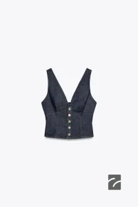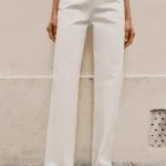 شلوار جین با کمر بلند و straight و قد کامل، دارای پنج جیب و کمربند نازک با جزئیات پارچهای به رنگ صدفی. این شلوار دارای فاق بلند و پاچههای بلند است و با زیپ و دکمه در جلو بسته میشود.