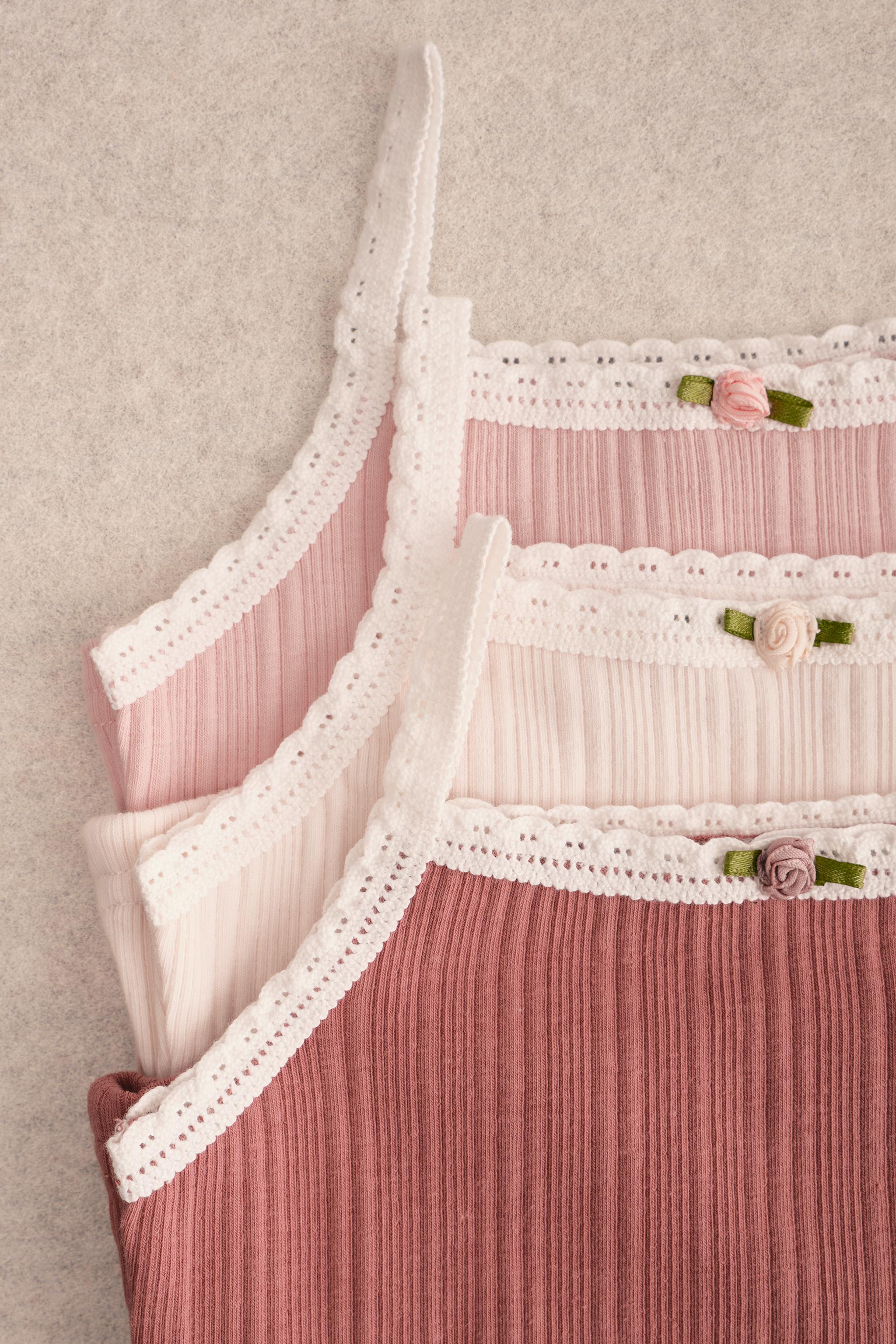 - Pamuklu kumaştan üretilmiş üç adet tişört içeren paket. Göğüs kısmında çiçek detayı bulunur.