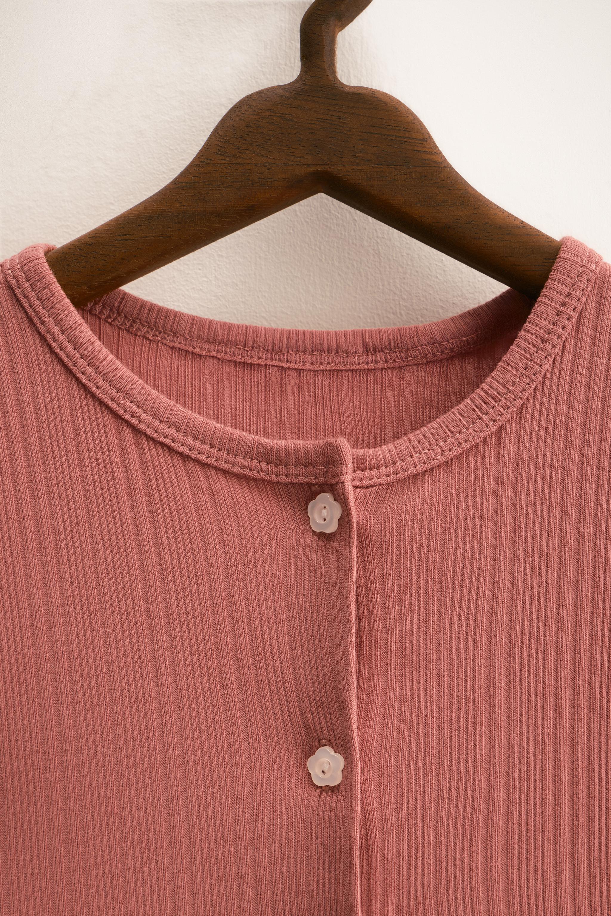 - Pamuklu kumaştan üretilmiş iki parçalı pijama takımı. Tişört bisiklet yakalı ve uzun kolludur. Önden düğme kapamalıdır. Pantolon, rahatlık sağlamak için elastik bir büzgüye sahiptir.